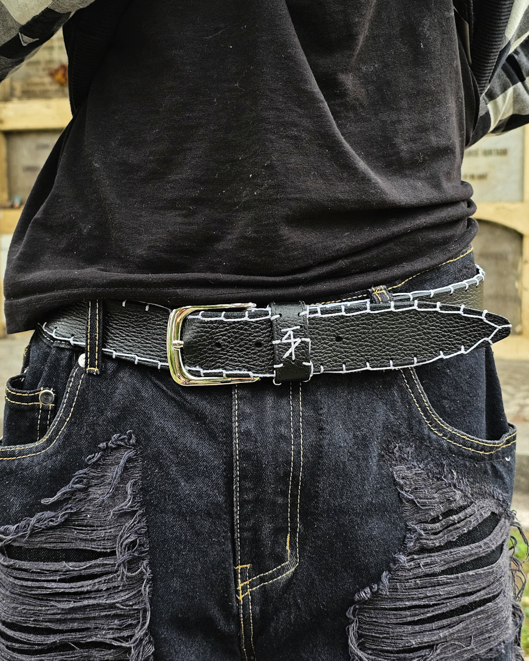 Pieza exclusiva con costuras blancas, rasgados a mano y trabilla de cuero, combinando carácter y elegancia en cada detalle.